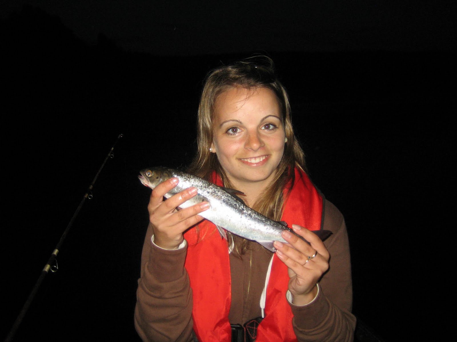 I hooked a really nice one that was a feisty jumper (that’s how we knew he was a nice size). I fouled up though when trying to get him close to the net and he got off the hook. Oh well, that is why it is called fishing, not catching. Sig had more luck, but her fish was smaller…